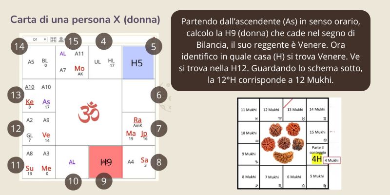 La scelta del Rudrākṣa più adatto non è casuale, ma segue un preciso calcolo astrologico basato sulla carta natale di ciascun individuo. In particolare, si prende in considerazione il pianeta (Graha) che governa la quinta casa (5H) per gli uomini e la nona casa (9H) per le donne.